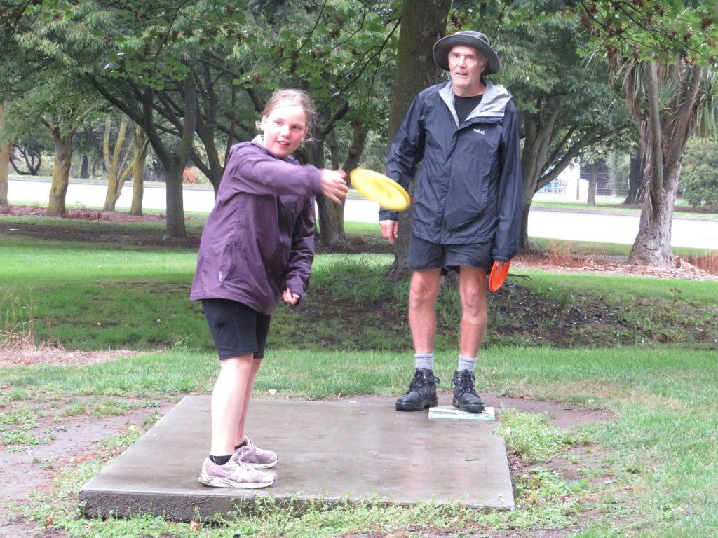 Rugby Carr launches her disc, under the guidance of session leader and keen disc golfer Steve Tallents. PHOTO TONI WILLIAMS