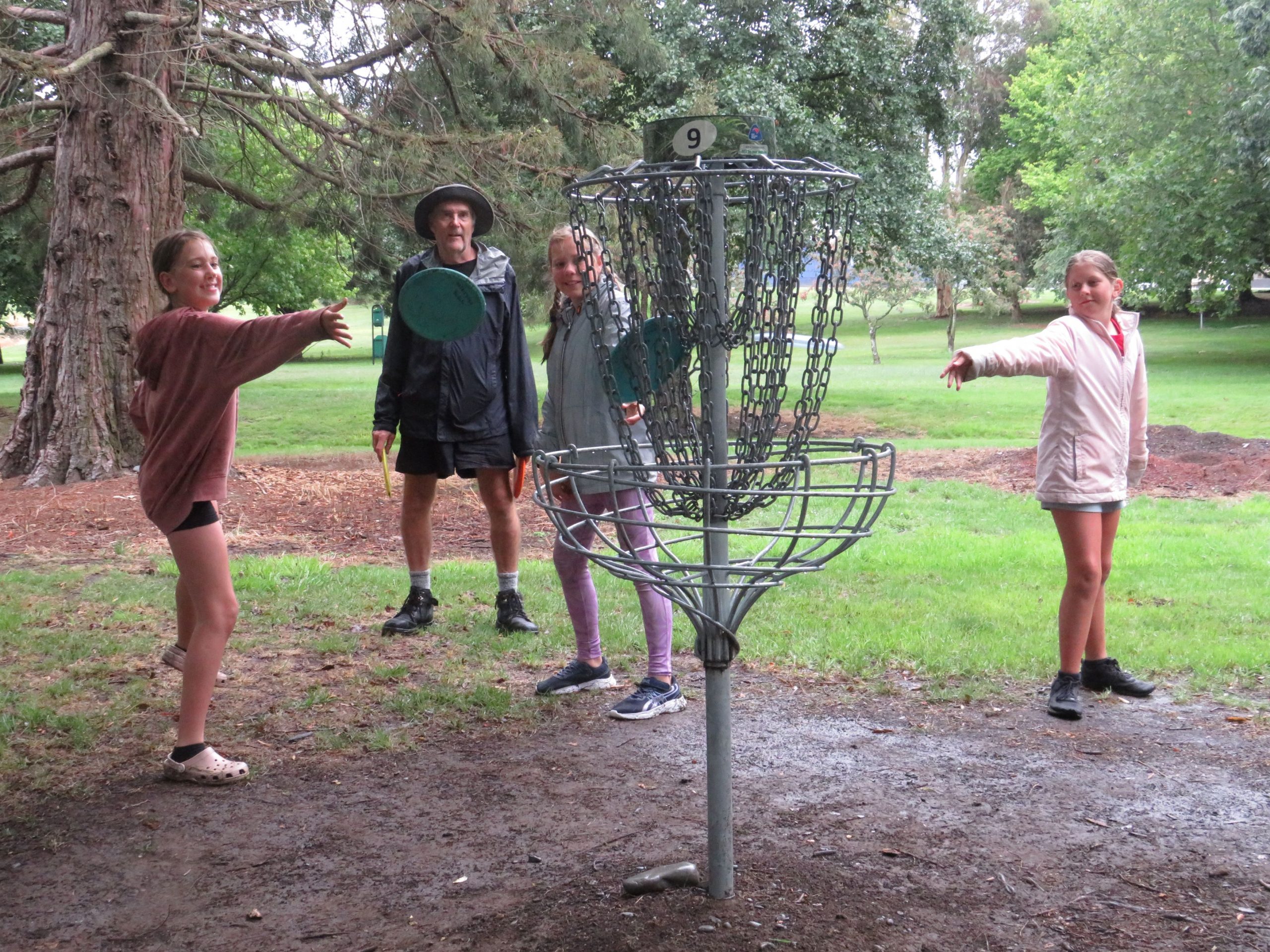 RAINY DAY FUN: Session leader and keen disc golfer Steve Tallents with, from left, Charlotte Wilson, Georgie Barr and April Horton during a game at Smallbone Dr Reserve. PHOTO TONI WILLIAMS