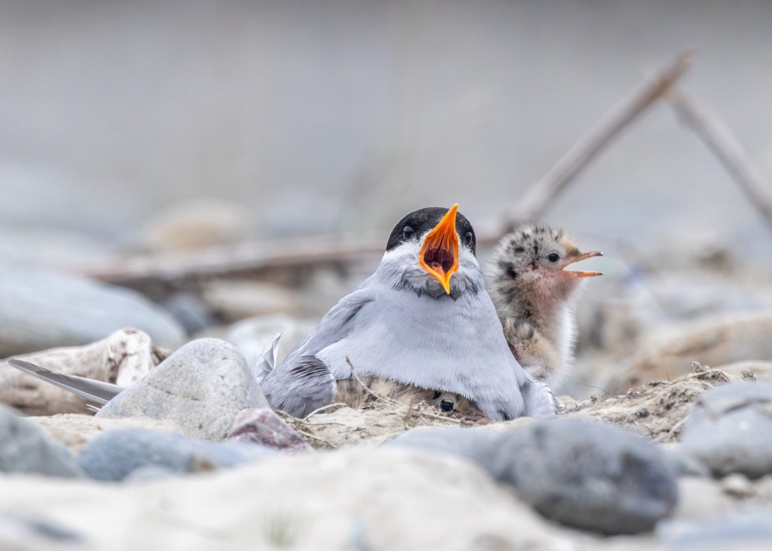 VULNERABLE: Watch out for birds nesting along braided rivers in Mid Canterbury and further afield, such as this black-fronted tern and chick on the Ashley River. PHOTO GRANT DAVEY