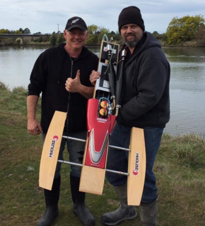 Daniel Steenhart, at right, with Richie Chapman raced a record breaking twin rigger model power boat. Steenhart is ready for this weekend's model power boat national championship at Lake Hood. PHOTO SUPPLIED