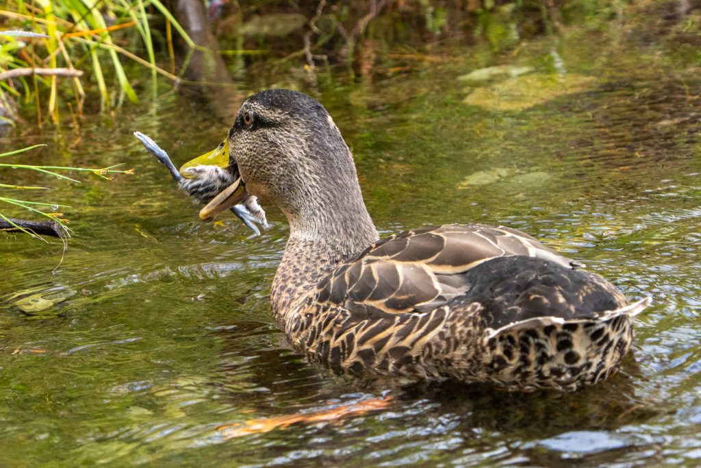 “Mallard ducks usually eat plant material, with a little bit of protein from insects and snails during the breeding season.