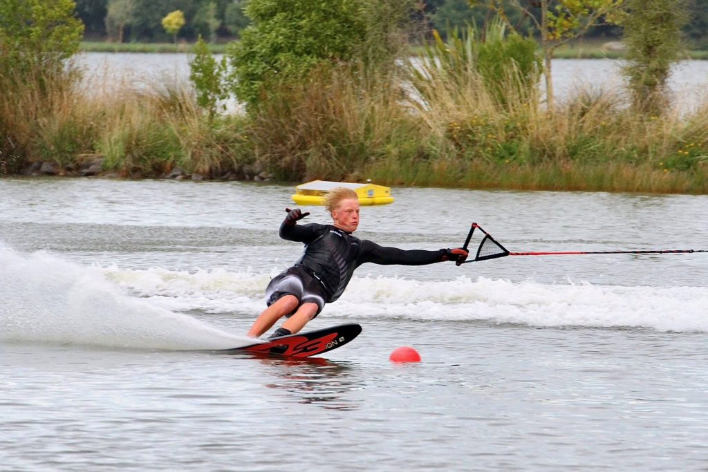 New Zealand co-captain Sam Bainbridge competing in the U21 slalom division. Below – There was plenty of action on the lake. PHOTOS WOOD WATERSPORTS