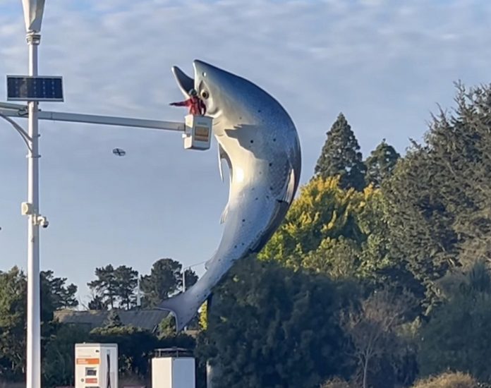 RETURNED: Rakaia’s beloved giant salmon has its cartoon dead eye emplatically removed by a contraactor on Saturday. SCREENSHOT FROM VIDEO BY AERON DESCHENES