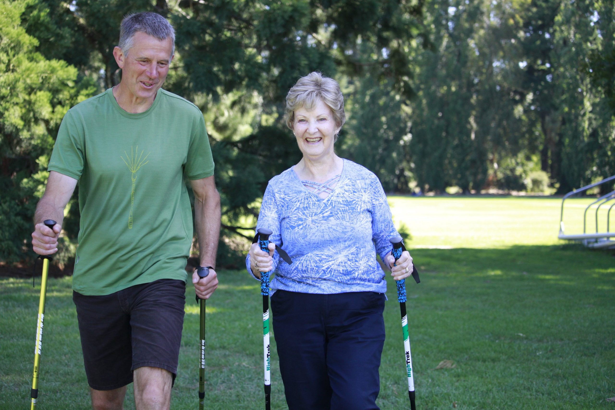 STRENGTH: Ashburton resident Bev Skates is bringing Nordic pole walking to the town, with the help of Parkrun organisers including Brendon Adam. PHOTO SUSAN SANDYS