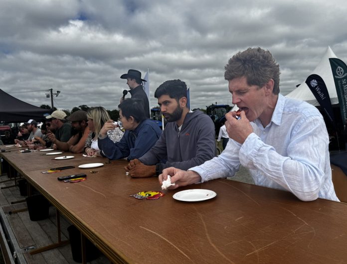 ‘SWEAT, DISORIENTATION’: Ashburton A&P Association president Ben Stock, at right, does his best to stay in the chilli eating competition. PHOTO SUSAN SANDYS