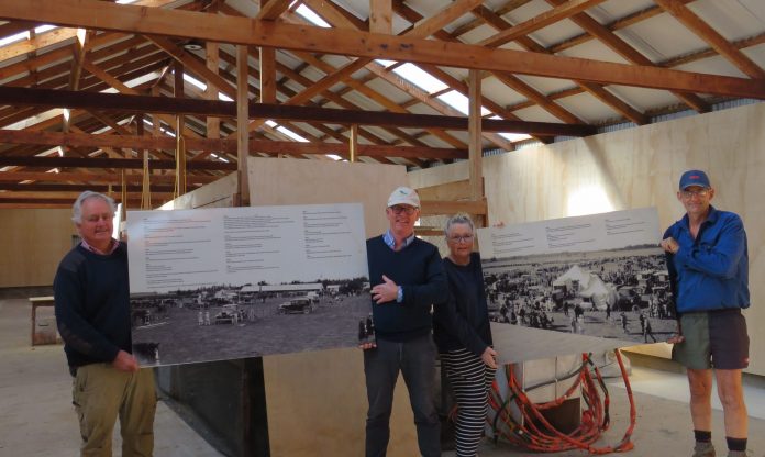 100 YEARS: Mayfield A&P Show centennial sub committee member Mark Morrow, from left, president James Murdoch, secretary Sonya Spencer and past president Andrew Mackenzie in the revamped produce shed with history panels set for display. PHOTO TONI WILLIAMS