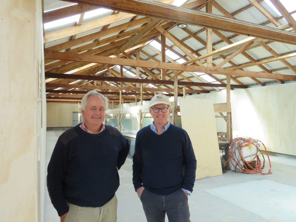 ON TRACK: Mayfield A&P Show centennial sub-committee member Mark Morrow, left, with show president James Murdoch in the produce shed due for completion by Christmas. PHOTO TONI WILLIAMS