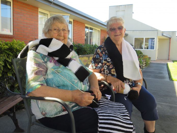 Knitting veterans Gwenda Ireland and Avis Wakelin of Ashburton have made black and white scarves bound for Gallipoli.