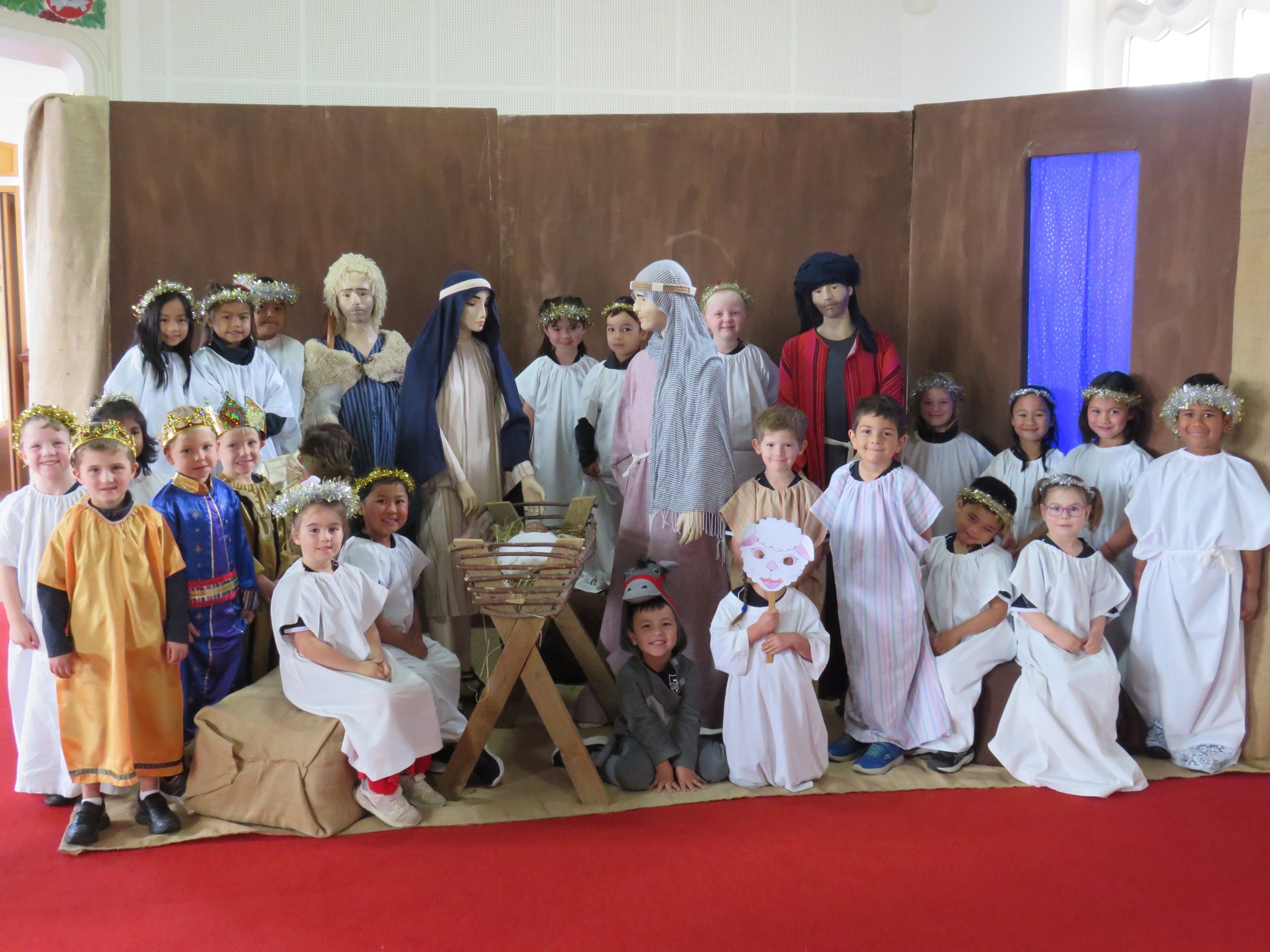They donned costumes to take on the roles of angels, shepherds, wise men and animals before stepping into the manger with Mary and Joseph.