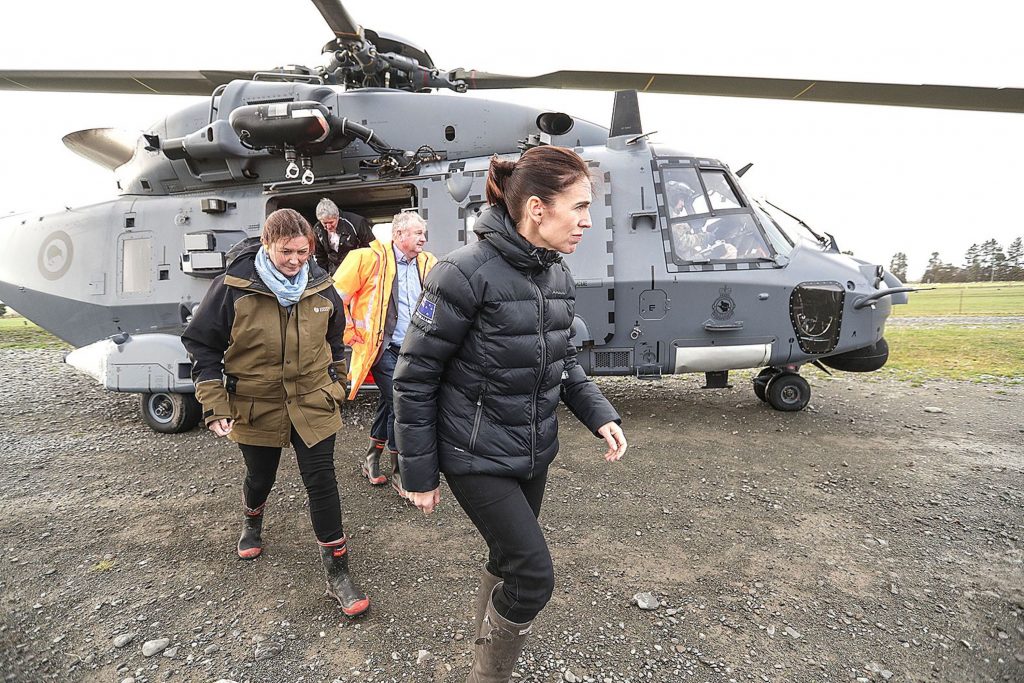 Mayor Brown with former Rangitata MP Jo Luxton and former Prime Minister Jacinda Ardern exit the army helicopter after an aerial tour of the Canterbury floods in May 2024. PHOTO SUPPLIED