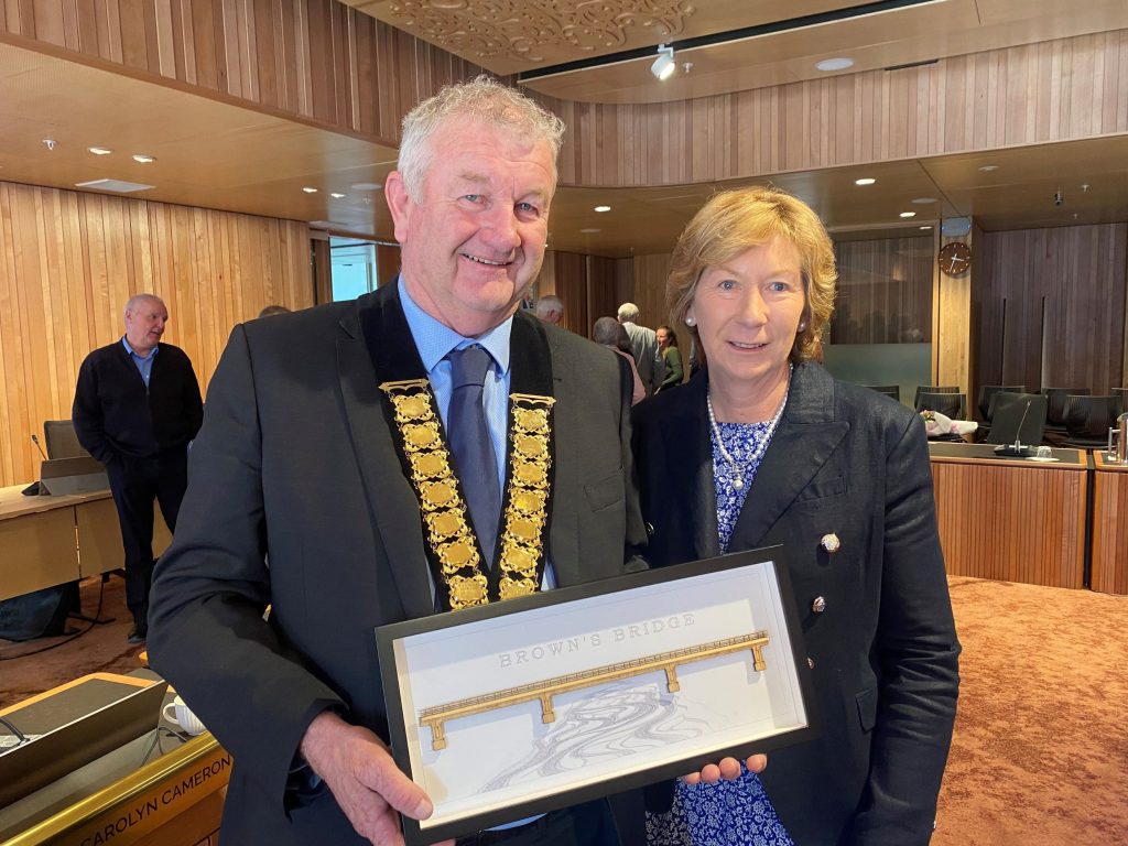 Neil Brown with his wife Judy, holding the artwork ‘Brown’s bridge’ – the Ashburton second bridge project – he was presented at his final meeting. PHOTO JONATHAN LEASK/LDR