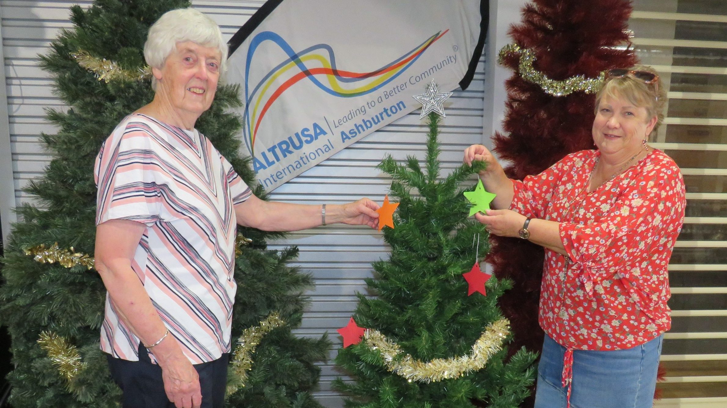Altrusa International of Ashburton members Helen Hooper, left, and Jane O’Reilly hanging stars on the Tree of Remembrance. PHOTO DELLWYN MOYLAN