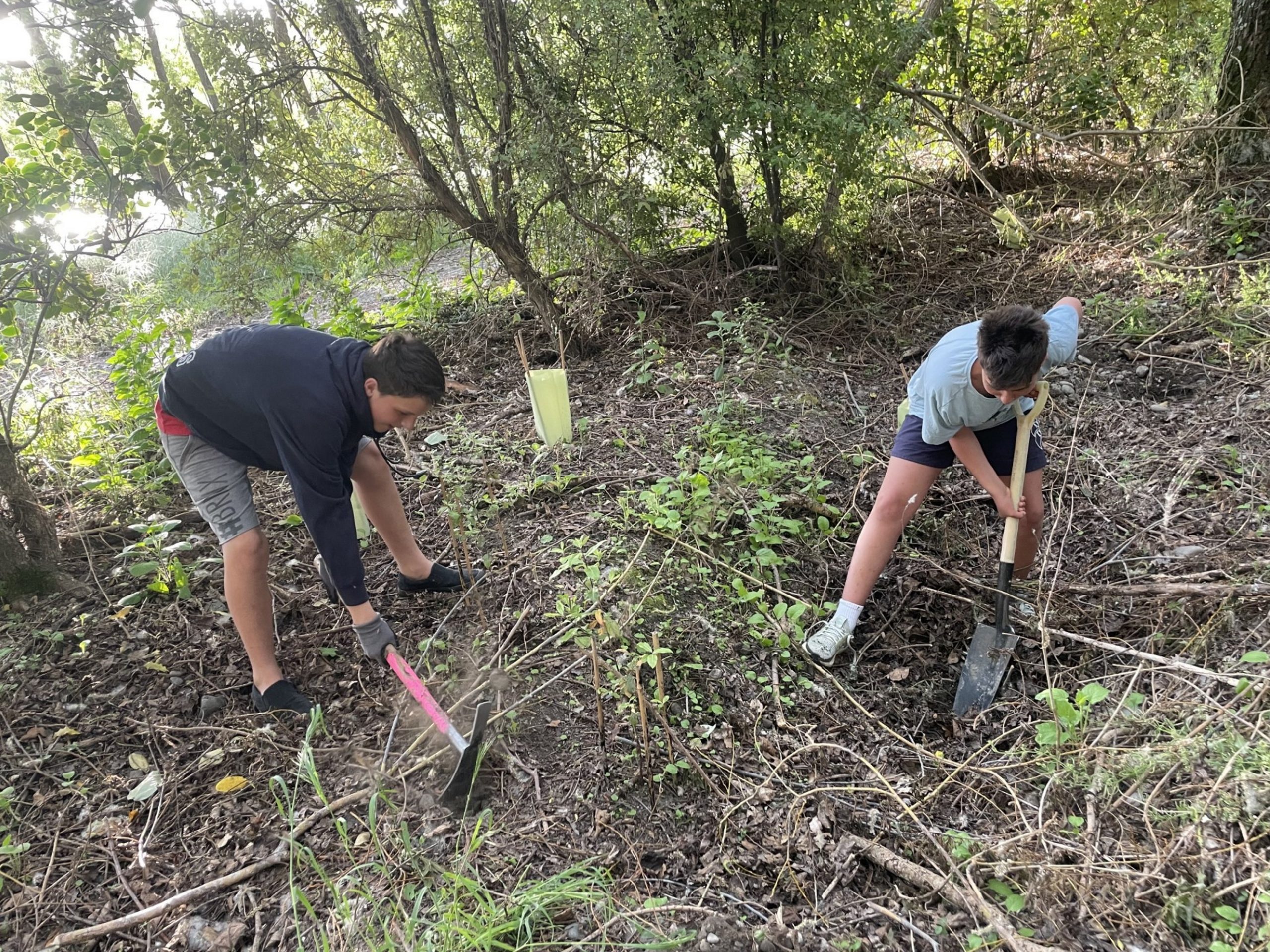 MUCKING IN: Ashburton 1st BB members Fergus Brown, left, and Joshua Greenland lend a hand at the Ashburton/Hakatere River Trail forest created by Ashburton resident Ross Hawthorne. PHOTO SUPPLIED